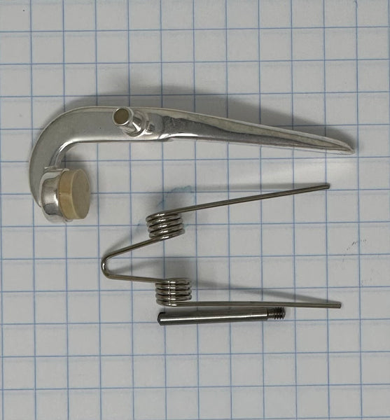 King Tenor trombone Water Key Replacement kit. Contains silver-plate water key TM0103702, spring TM01038, screw SP0805605, and a natural cork. Fits King 3B style Tenor Trombones and others. Contact me if you wish to verify your model's fit or you need other parts.
