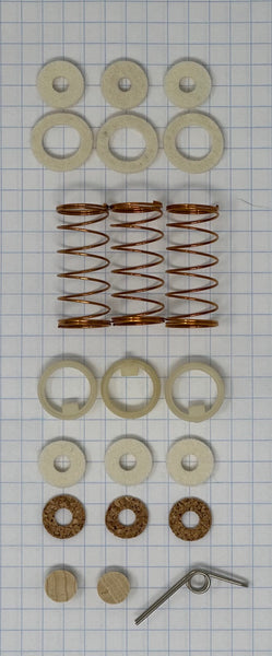 King Trumpet tune-up kit, easy to install. Fits Older King's 600 series (before 491500), Cleveland, & Silver Flair with top action springs (springs are not internal to the piston). Not all soft parts fit every instrument. Not for newer Silver Flair trumpets with the valve guide & spring internal to the piston, see my item ID# 16127 for that kit. Contains finger button felts, top cap felts, springs, valve guides, stem felts and cork washers. Also contains 1 water key spring and 2 natural corks. Contact me if you wish to verify your model's fit or you need other parts.